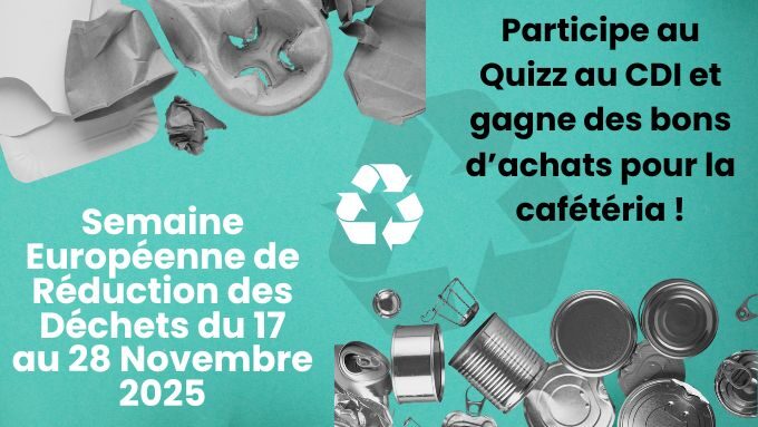 Par SOPHIA BOUBEKEUR, publié le vendredi 14 novembre 2025 10:39 - Mis à jour le vendredi 14 novembre 2025 10:50Du 17 au 28 Novembre participe au quizz au CDI et gagne des bons d'achats pour la cafétéria !! -