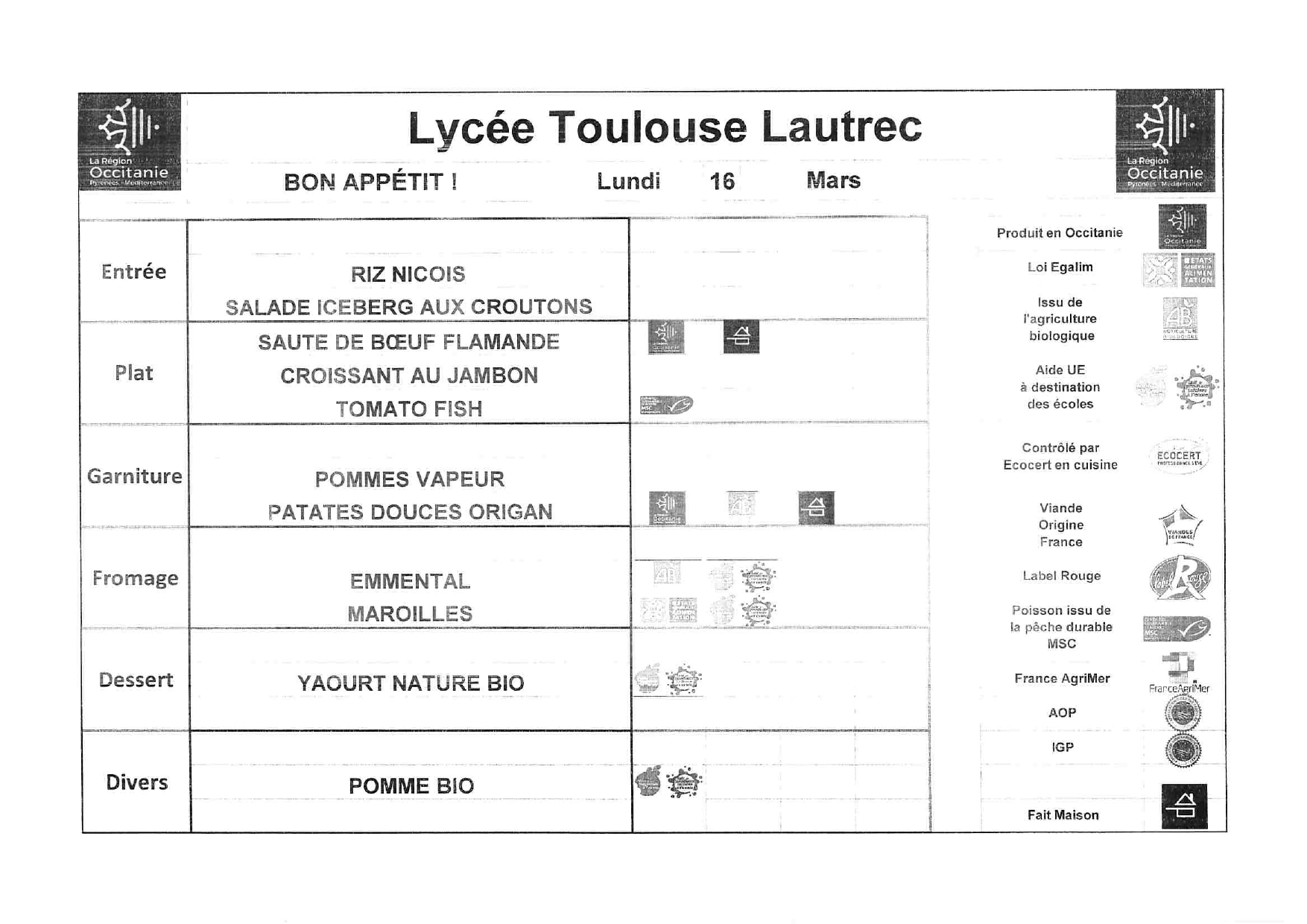 Le site de la cuisine centrale des lycées informe sur les menus de la semaine.